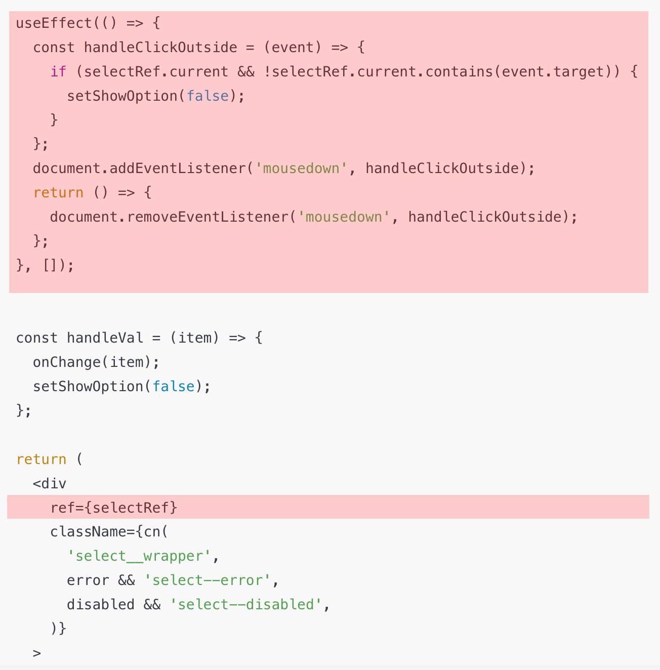 // 1. Select 컴포넌트 코드export const Select = ({ placeholder = 'Please Select', error = false, disabled = false, option = [], val, onChange,}) => { const [isShowOption, setShowOption] = useState(false); const handleVal = (item) => { onChange(item); setShowOption(false); }; return ( setShowOption((prev) => !prev)} onMouseDown={(e) => e.preventDefault()} > ..